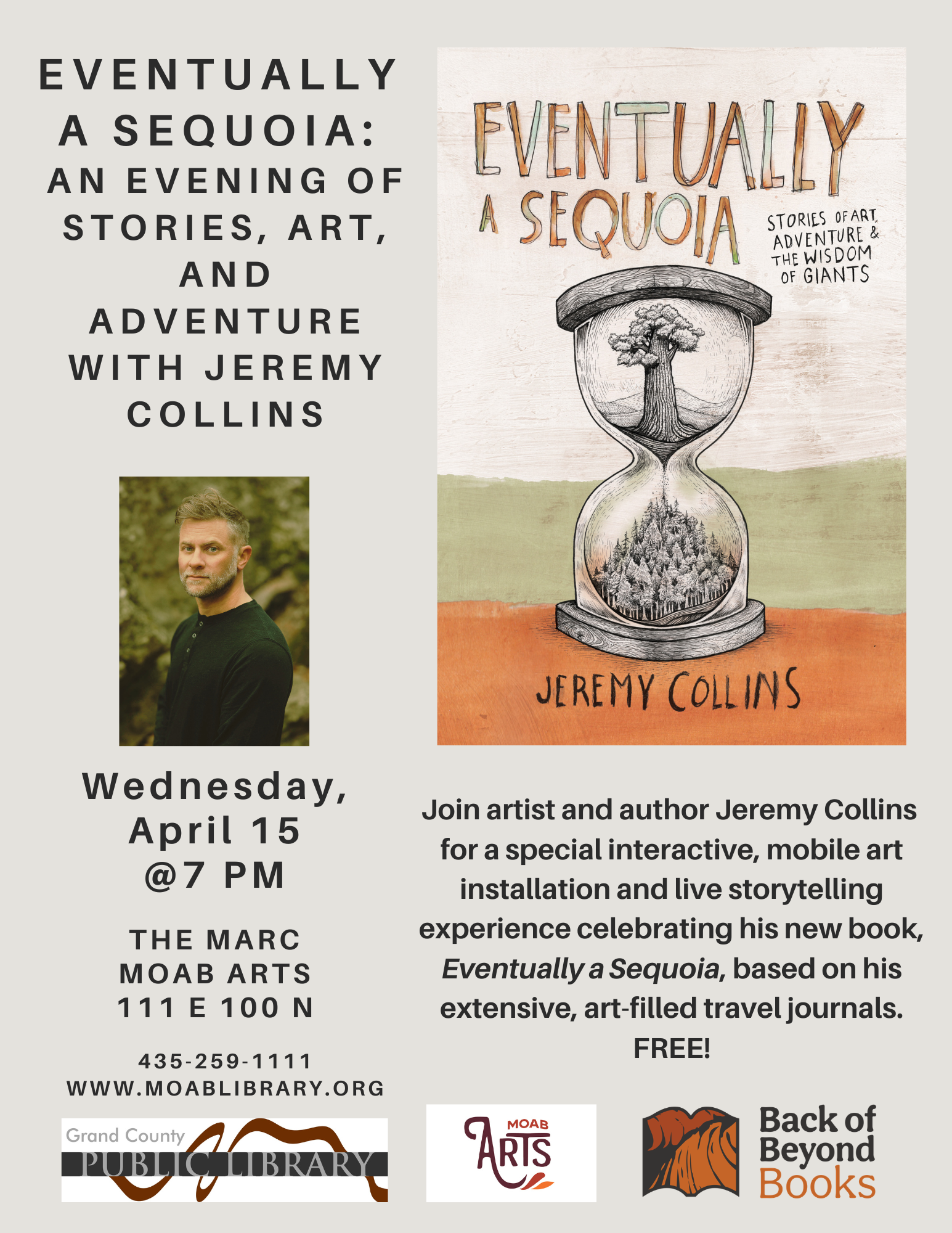 Join artist and author Jeremy Collins for an immersive, multimedia event around his new book Eventually a Sequoia: Stories of Art, Adventure & the Wisdom of Giants! Based on Jeremy’s extensive, art-filled travel journals, Eventually a Sequoia is an inspirational and vivid exploration of the natural world and how it can empower an individual to grow, change, heal, and thrive. Part memoir, part manifesto, Eventually a Sequoia is an invitation for all of us to develop a deeper appreciation for the natural world and our place in it. On April 15, Jeremy will share a very special interactive, mobile art installation and live storytelling experience that immerses the audience inside of Jeremy’s artist sketchbook. This presentation will be followed by time for audience Q&A, and a book signing.